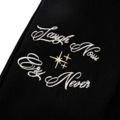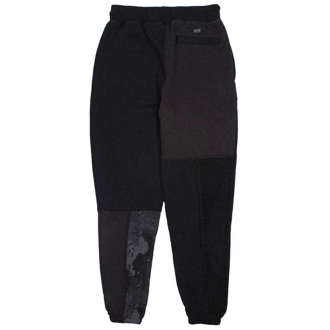 Vintage washed , pieced sweatpants with combined front and back sides of lightweight fleece in multiple black fabrics. Featuring raw edge and coverstitched seams and screenprinted graphics.